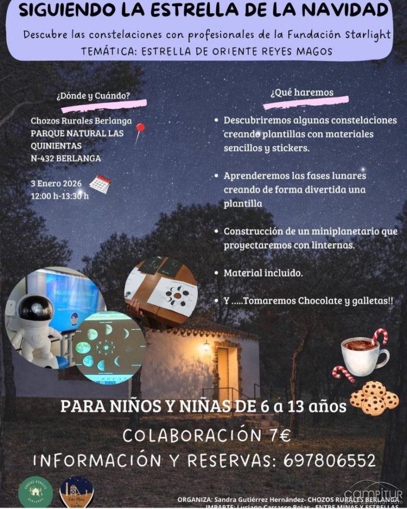 El próximo 3 de enero de 2026, los Chozos Rurales de Berlanga, en pleno Parque Natural Las Quinientas, acogerán la actividad infantil “Siguiendo la estrella de la Navidad”, una propuesta educativa y lúdica que permitirá a los más pequeños acercarse al mundo de la astronomía de una forma creativa y participativa.