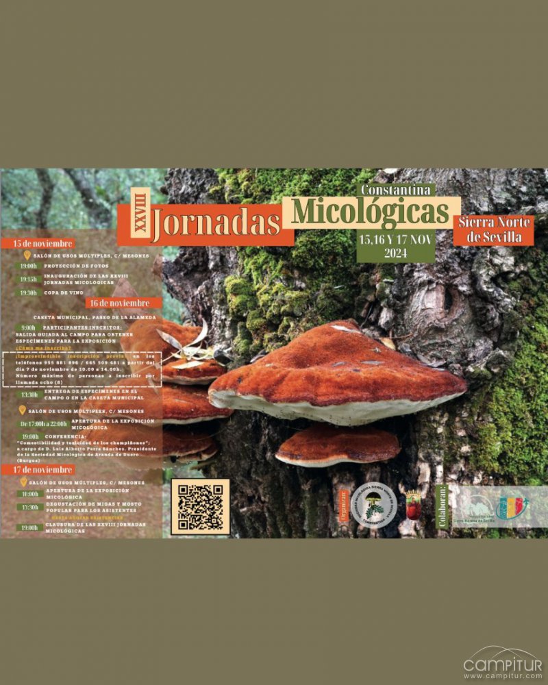 Constantina acogerá del 15 al 17 de noviembre de 2024 las XXVIII Jornadas Micológicas, un evento organizado por la Asociación Micológica Sierra Norte de Sevilla y el Ayuntamiento de Constantina y que cuenta con la colaboración del Parque Natural Sierra Morena de Sevilla.