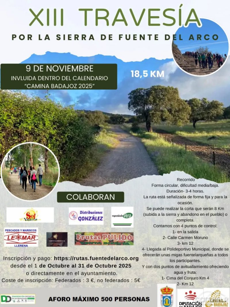 Las inscripciones ya están abiertas en https://rutas.fuentedelarco.org y podrán realizarse hasta el 31 de octubre de 2025, tanto a través de la web como directamente en el ayuntamiento. El coste es de 3 euros para federados y 5 euros para no federados.